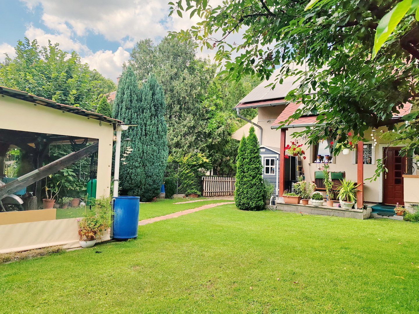 A kert hátsó részébe fedett kiülő, kikapcsolódásra alkalmas rész várja új lakóját!