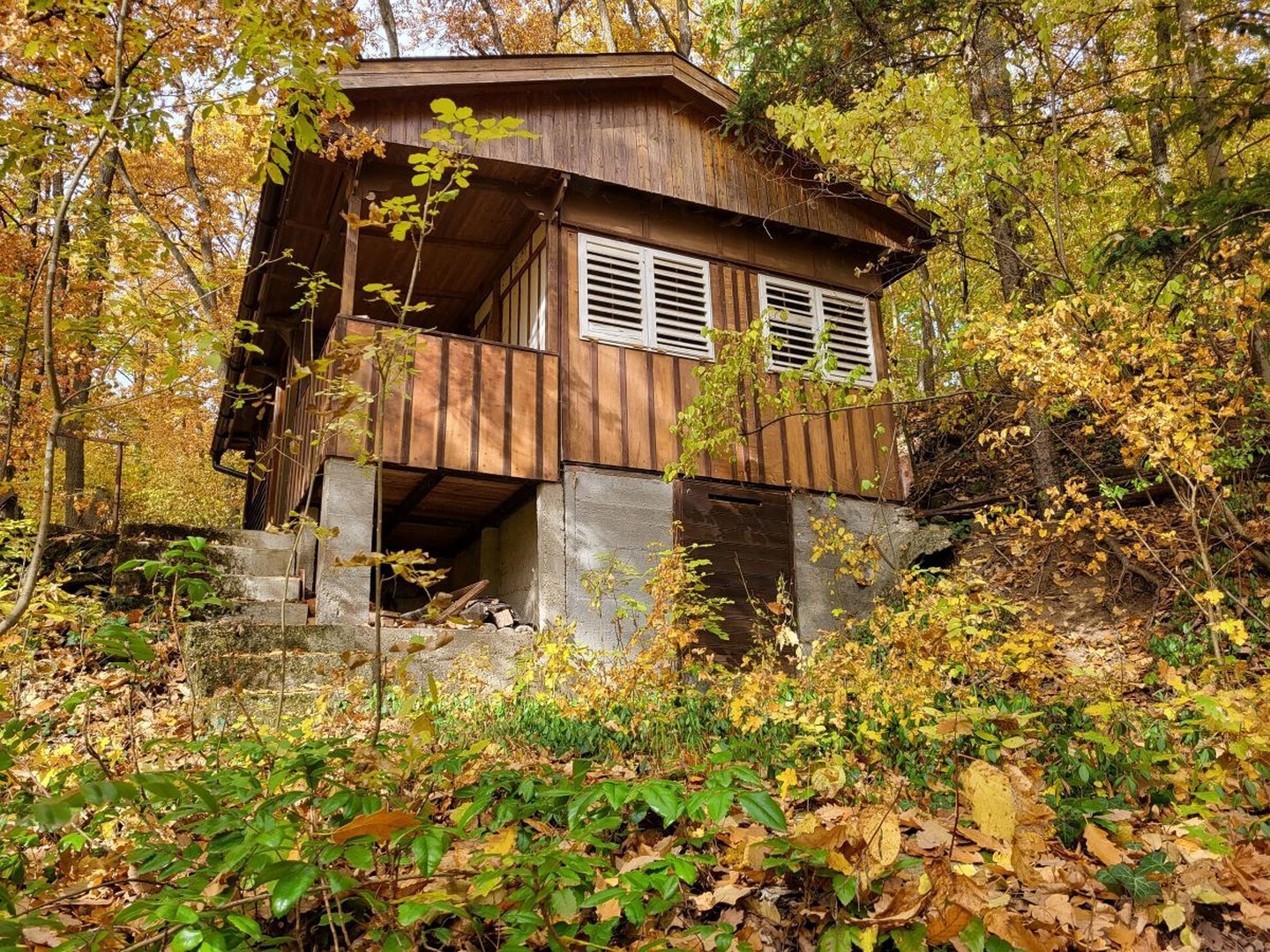 Eladó egy 1000 nm-es lejtős erdei telken, nagy fák alatt megbúvó igazi kuckós kisház.