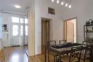 The layout is excellent: living room (28.5 sqm), two separately accessible bedrooms, a kitchen-dining area with windows, bathroom with hydromassage bathtub and separate shower, separate toilet, and pantry. Flooring is tile and laminate parquet. With its southern-eastern orientation and large windows, the apartment is flooded with natural light throughout the day. The 3.7-meter ceiling height, original interior doors, and shutters provide a classic bourgeois atmosphere. All rooms have windows, air conditioning is prepared, with gas boiler and underfloor heating.