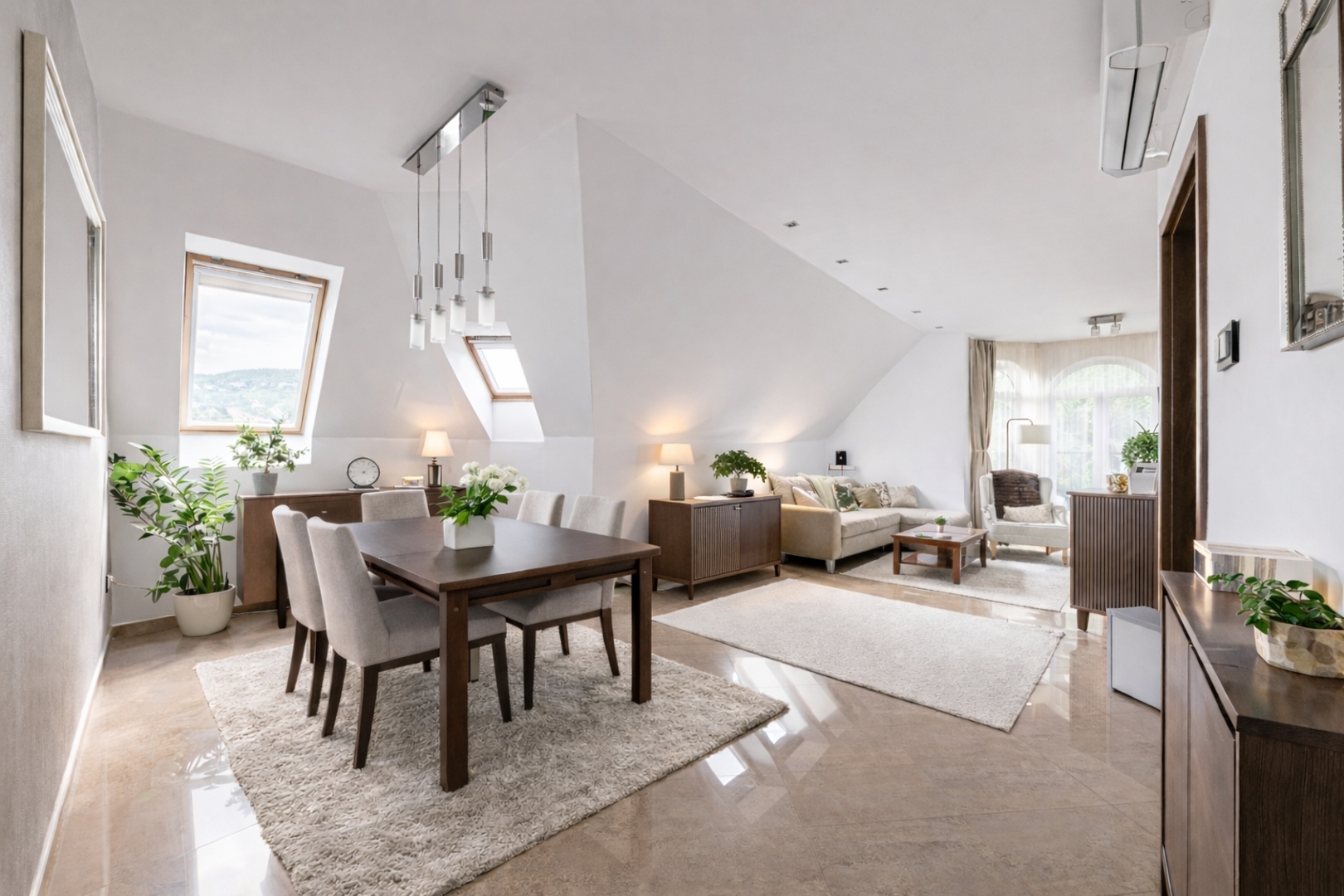 A XI. kerület elegáns, villaövezeti részén, Sasadon található ez a bruttó 100 m²-es, teljes szintet elfoglaló, panorámás lakás, amelyet a nyugalom és a kiváló fényviszonyok jellemeznek.