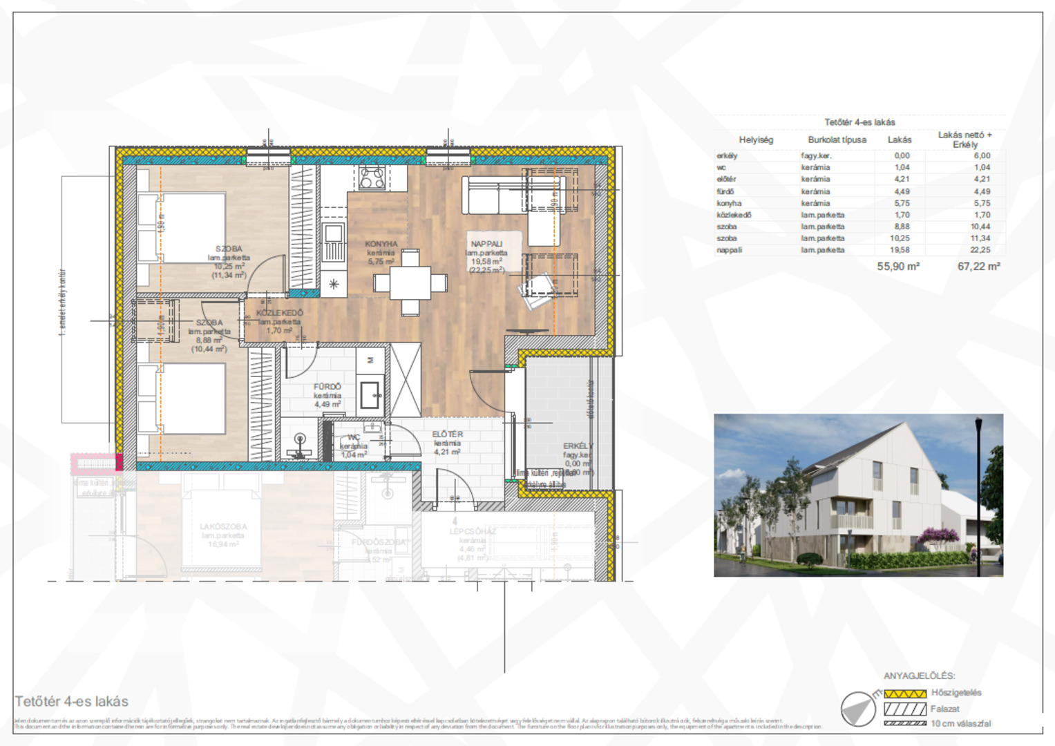 67,22 m2-es lakásban lévő helyiségek: